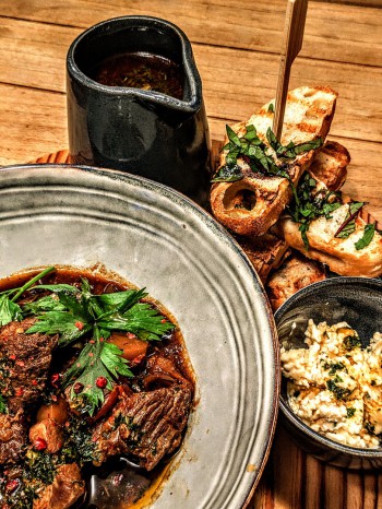 trocken gereift, geschmort in röstgemüse & knochenbrühe, daraus wird der jus reduziert