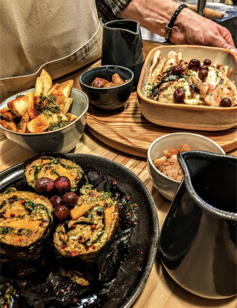 gefüllt mit gefarcten linsen, gewürzen & lauch, in der gusspfanne gebraten, haferjus aus röstgemüse gezogen, winterkrautpesto